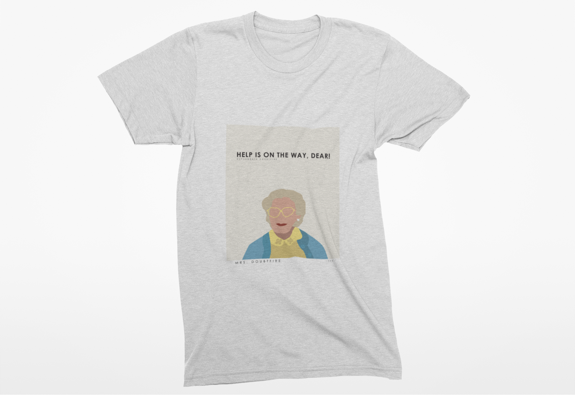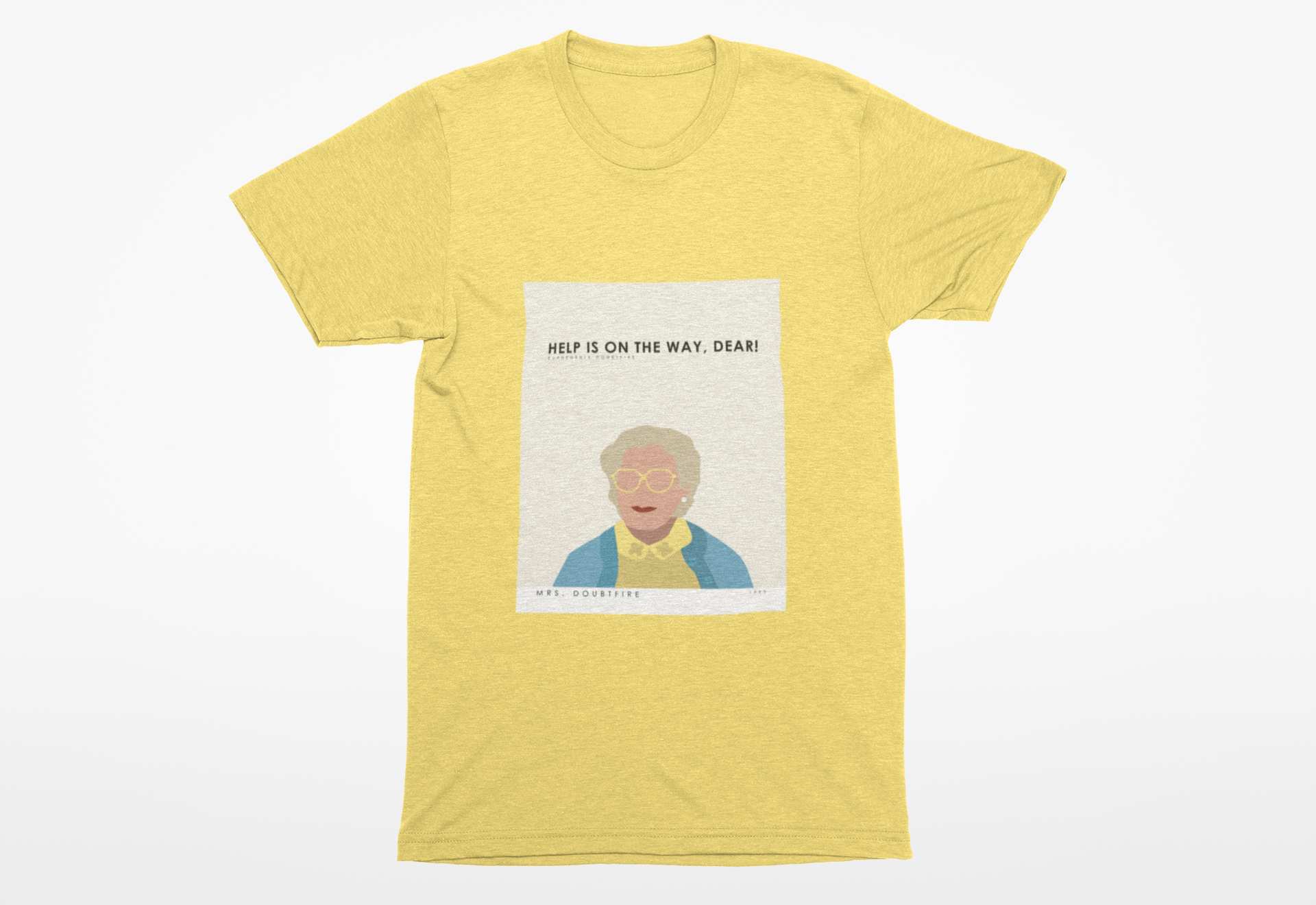 Bring back the magic of '90s cinema with this playful Mrs. Doubtfire tribute tee. Featuring the iconic "Help is on the way dear" catchphrase that made audiences laugh, this throwback shirt celebrates one of the decade's most beloved comedies. Perfect for fans of classic family films and nostalgic fashion, it's a conversation starter that works for casual outings, movie nights, or anyone who grew up loving this timeless character. Soft, comfortable, and unapologetically retro.
